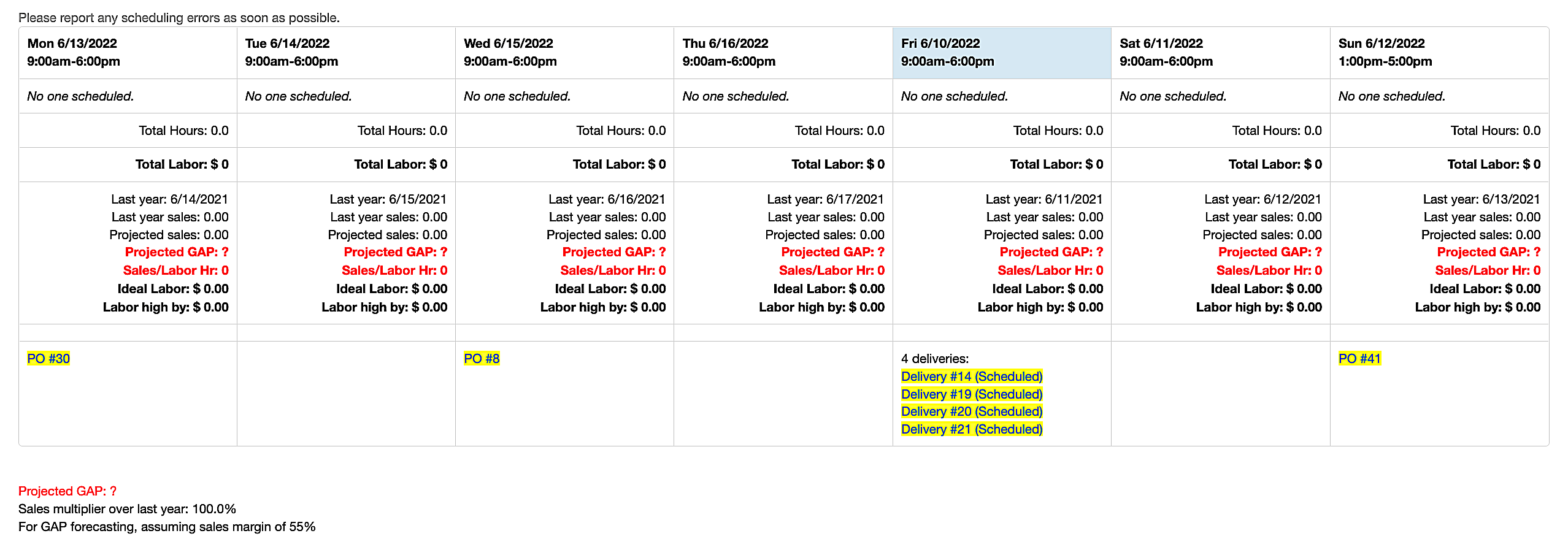 - Projected GAP based on current schedule and projected sales