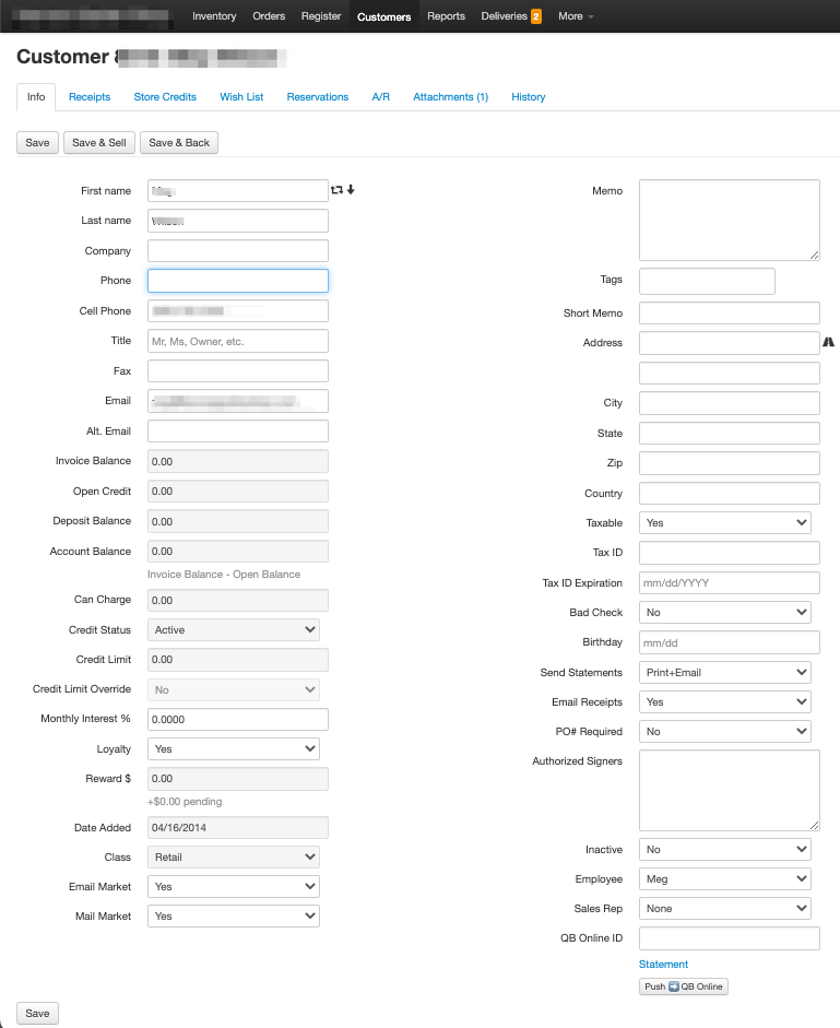 Memo- The memo field allows you to make notes on a customer's account to remind other employee of details pertaining to the customer. These notes will appear in both the account profile page and in a popup box on the register screen after the customer is selected.