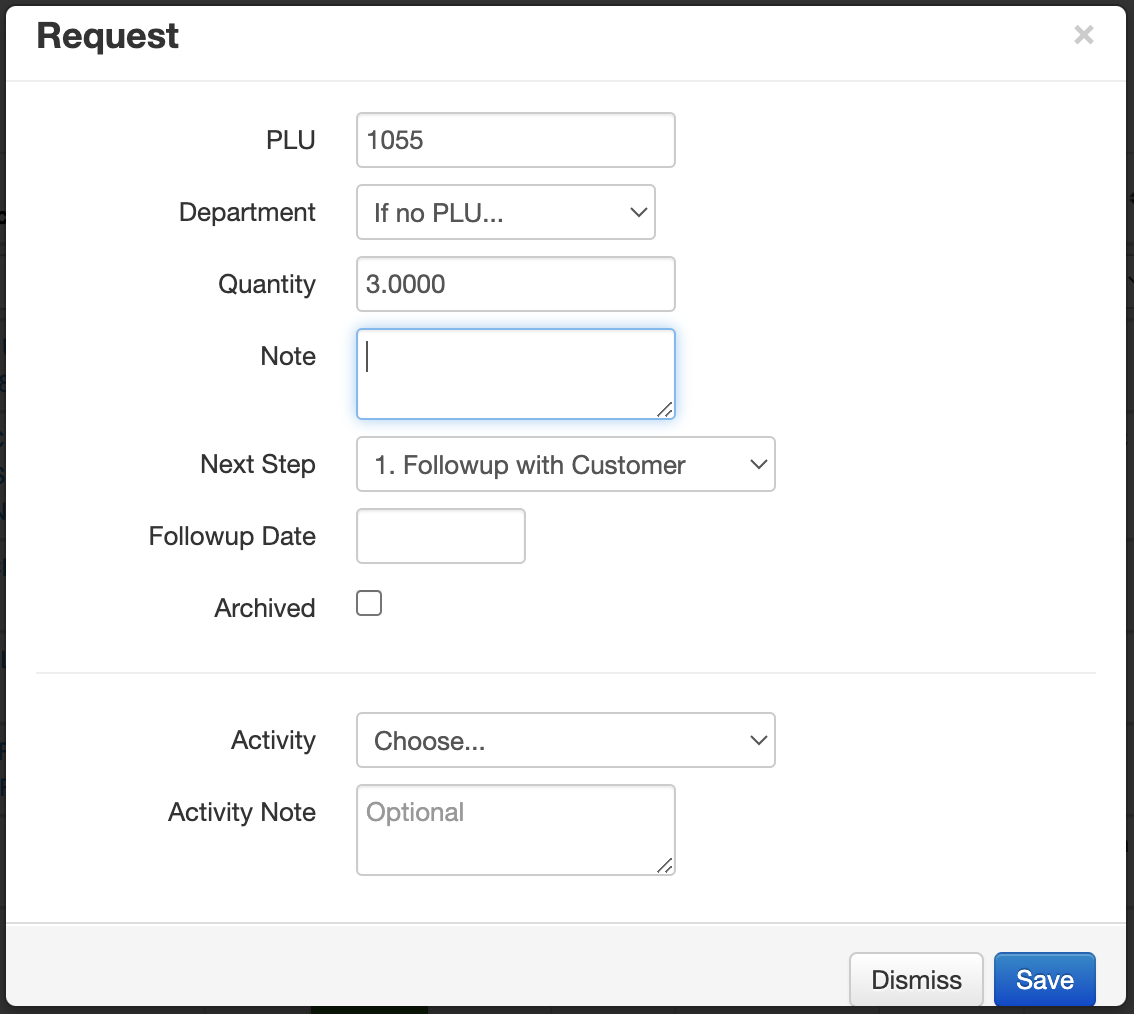 - Edit/Delete/Fulfill- Select the edit icon to make any changes to the entry or add an activity. The dialogue modal is shown below. Select the Delete icon to remove the Wish List Entry. This action cannot be undone. Select the fulfill icon to mark the entry as complete. You can fulfill an entry manually by selecting this button, or VMX POS will automatically prompt you to fulfill when you check the customer out for their requested item and their account is added to the sale.