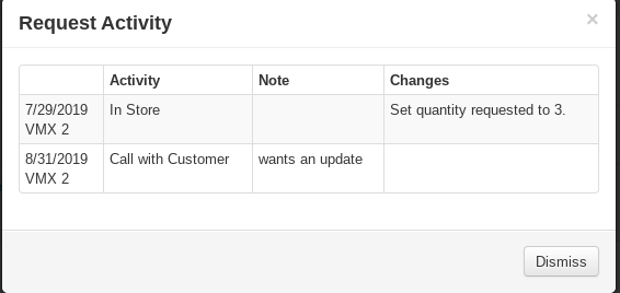 - Edit/Delete/Fulfill- Select the edit icon to make any changes to the entry or add an activity. The dialogue modal is shown below. Select the Delete icon to remove the Wish List Entry. This action cannot be undone. Select the fulfill icon to mark the entry as complete. You can fulfill an entry manually by selecting this button, or VMX POS will automatically prompt you to fulfill when you check the customer out for their requested item and their account is added to the sale.
