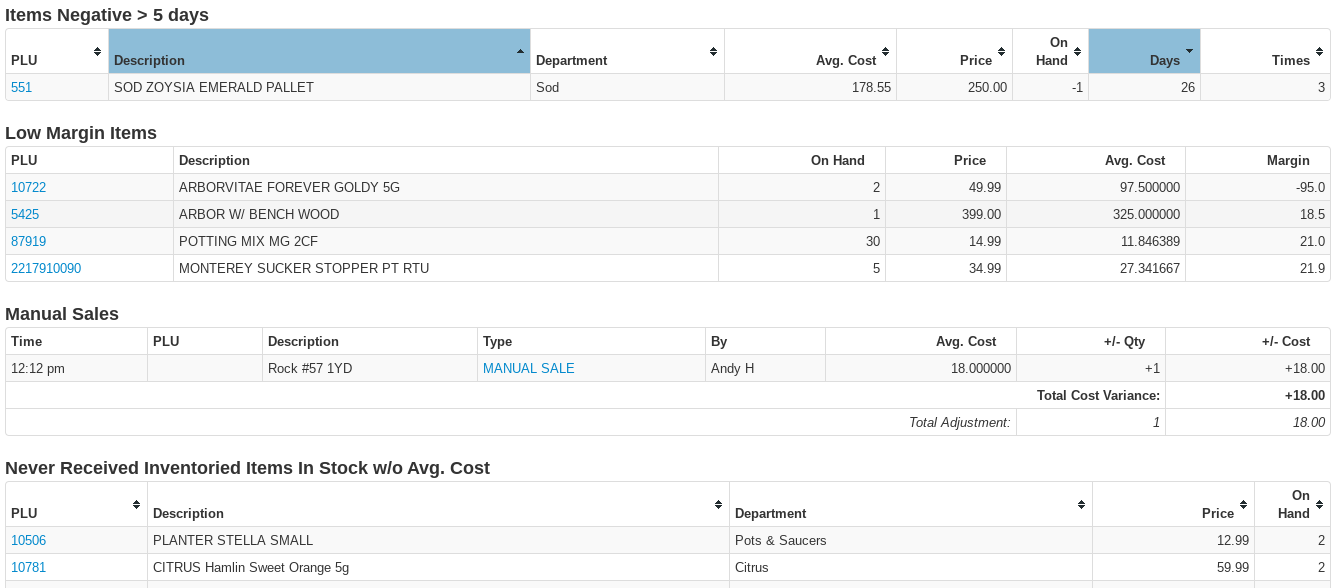 This report summarizes all the items in inventory that are on hand, have been manually added, have never been received, and therefore do not have an average cost. This means margin cannot be calculated for the item.