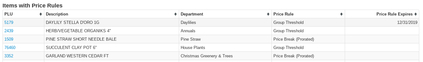 This table summarizes the items in inventory that have a price rule, or an amendment to their usual price.