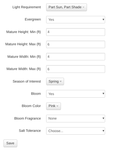 - When you add or edit an inventory item, you can fill in values for each attribute. This is shown in the first screenshot, where attributes like Light Requirement, Evergreen, Mature Height, and others are filled with specific values.