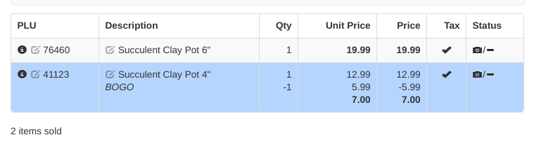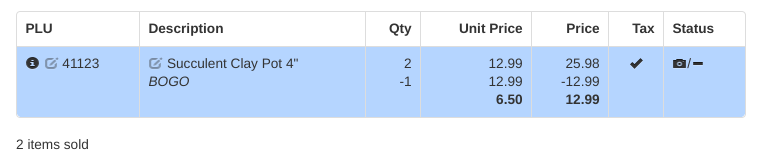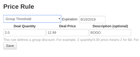 Think “BOGO” when you hear group threshold. This type of price rule applies when 2 or more of the same item are rung up. To set up a “buy one get one free” sale, select Group Threshold from the drop down, enter the quantity as 2, the deal price as whatever the regular retail price for one of the items is, and the description as “BOGO”. This will automatically apply when 2 or more of the item are rung up.
