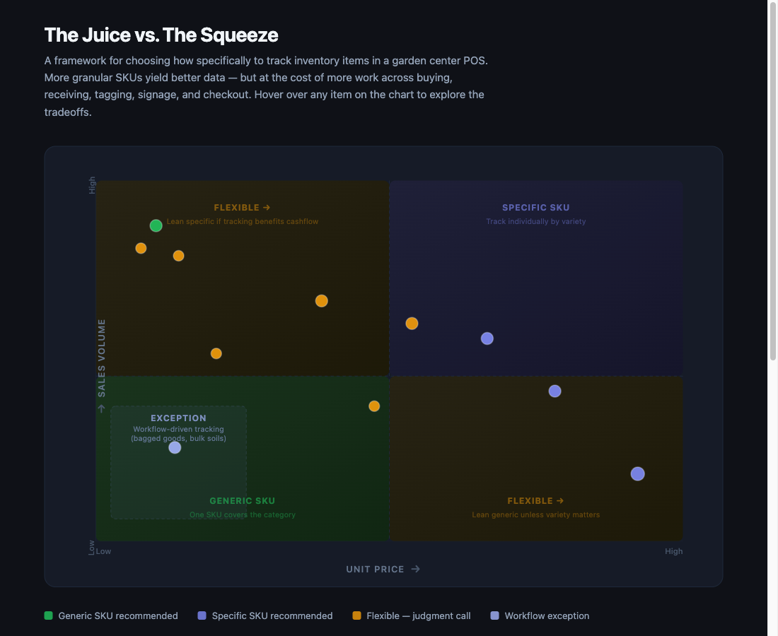 This isn't an all-or-nothing decision. You can track 4" annuals generically while breaking out Snapdragons and Pansies as separate SKUs — because your buyer cares about those numbers. Each department can be decided independently.