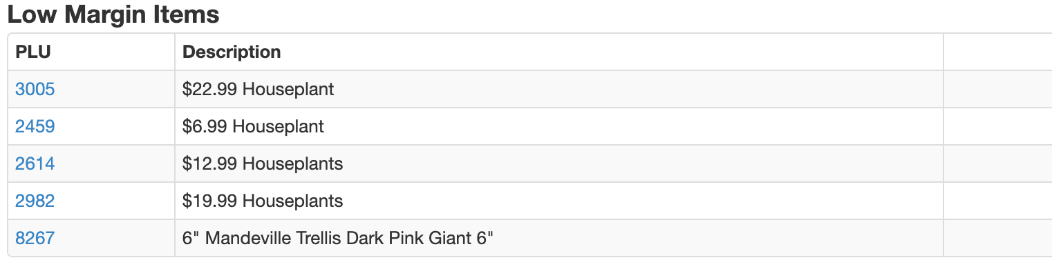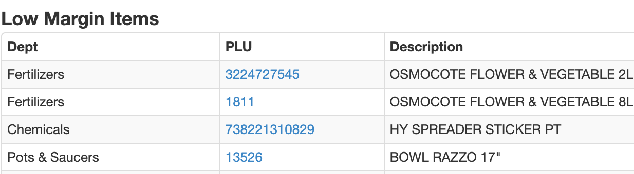 The Low Margin Items table now includes each item's department:
