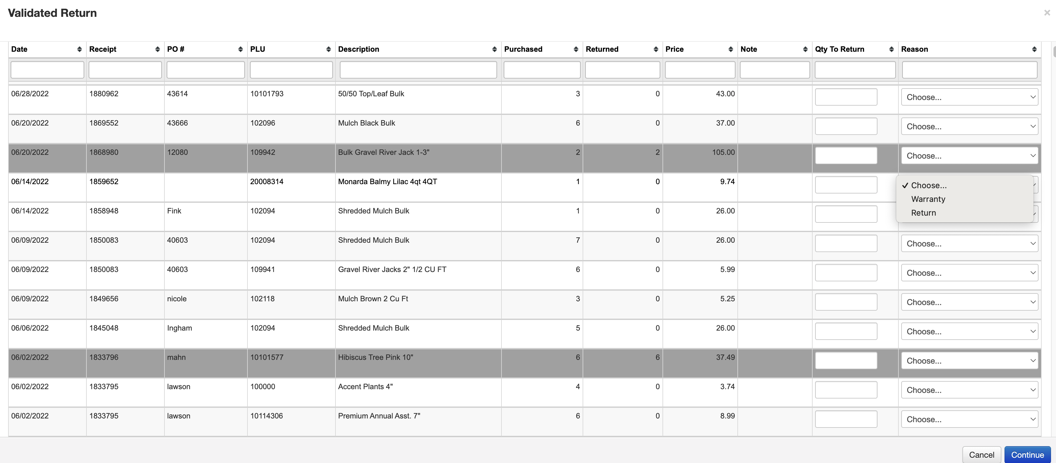Add a customer to a new ticket and select the "Return (Validated)" button. VMX will generate a list of items the customer has purchased within your return or warranty window (pictured below). \ See which items have already been warrantied or returned, enter the quantity to return and the reason, and search by date, receipt #, item, PO#, and more all from this list!