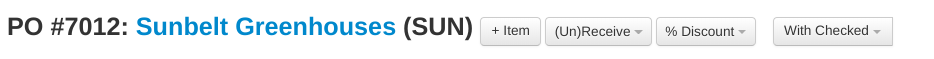 The top of the order page show the order’s PO#, followed by the vendor name, the vendor code in parentheses, the add item button, (un)receive button, % discount button, and with checked button.
