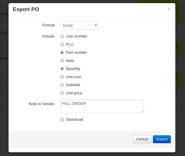 button to create an Excel spreadsheet or PDF of the PO. Use the popup to select the file type, which columns to include, edit notes, and whether or not you want to download the file.