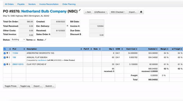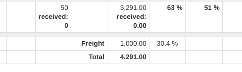 Beneath the items on the table, view the total items received, cost of received items, margin, and margin with shipping. The total cost of the order is also shown, including freight and a freight percentage, at the bottom of the table.