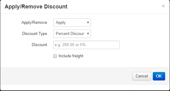 - Apply/Remove Discount: add a vendor discount on all the items and toggle the check button to include or exclude freight prices in the discount. You can also select a percentage based discount or an amount.