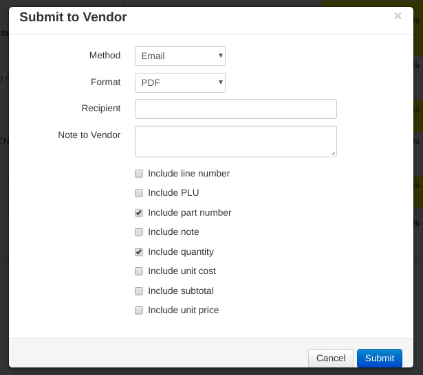 button to send a PO to the vendor (or to anyone) right from the order page! Use the popup to select which columns to include and edit notes. \