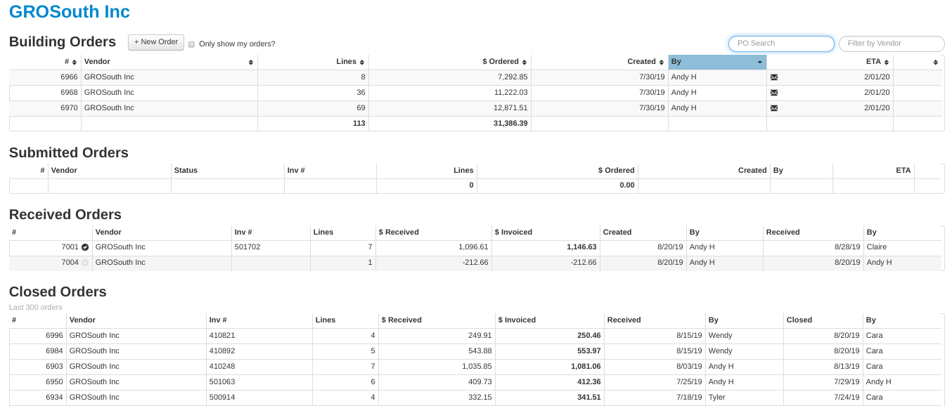 Select the "+ PO" button to add a new PO for the vendor. Learn more about order pages here: