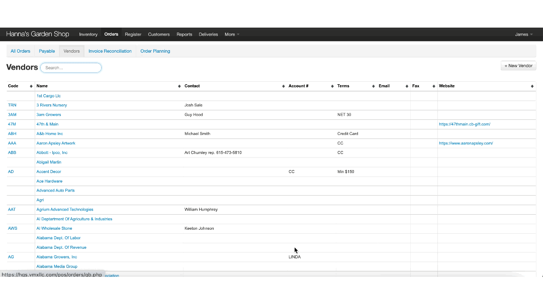 Get a quick view of different vendors and their information on the vendor page! The table of vendors includes the vendor code, name, a contact person, account number, payment terms, email address, fax number, and website information.