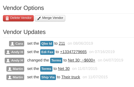 Delete the entire vendor or merge two vendors under Vendor Options. Chronologically view updates to the vendor under the Vendor Updates heading.