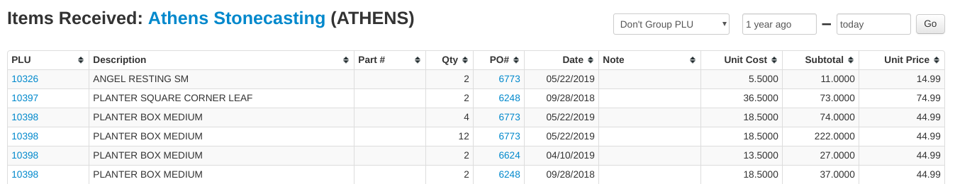 | Qty | Quantity received over the entire time period if grouped and quantity received on each PO if ungrouped |