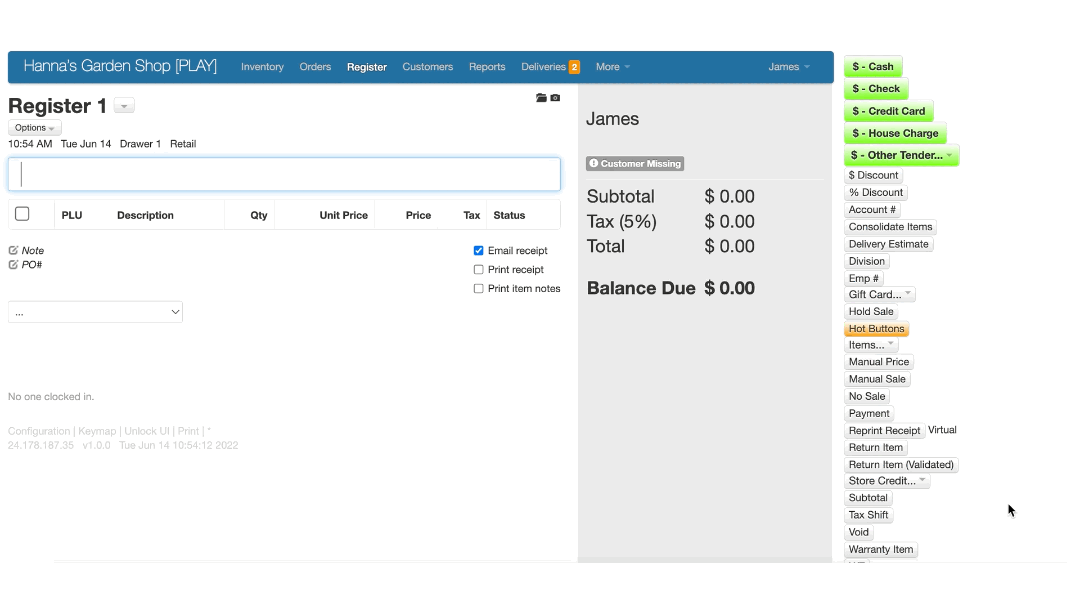 - If a customer pays with cash, enter the amount they provided into the register search bar. For example, if a customer pays with a $20 bill, enter “2000” or “20.00”.