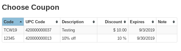 After highlighting the desired item or subtotal, select the "$ - Store Coupon" button from the button panel and you will be redirected to the page shown above. From here you can examine the active coupons and select one by clicking on it and apply it to the highlighted item or subtotal.