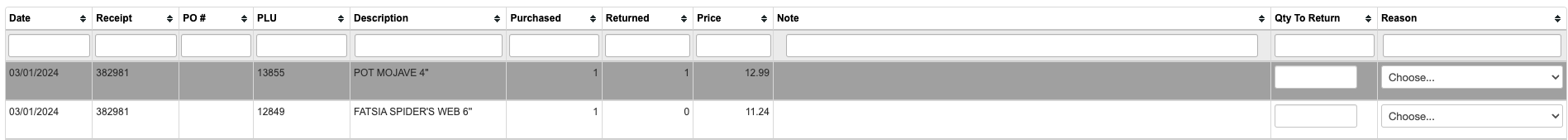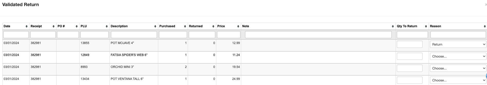 - For subsequent validated returns, items previously returned will be grayed out to indicate a previous return.