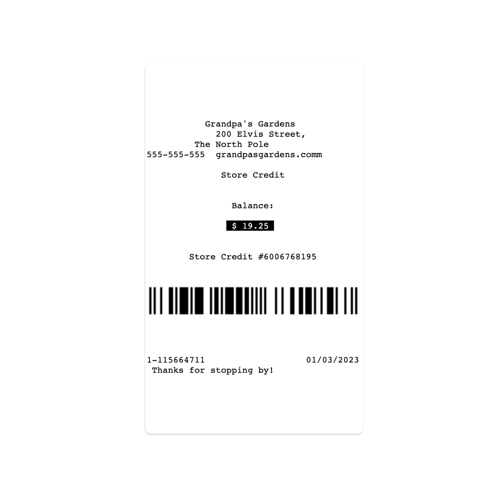 A receipt will print with the store credit number which will be used when redeeming.