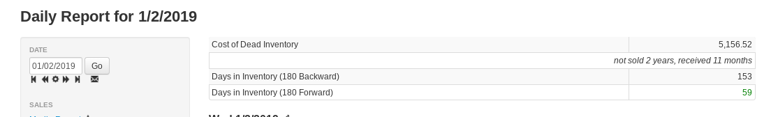 Days in Inventory- the cost of inventory in stock now divided by the cost of good sold in a 180 day period (either forward or backward)