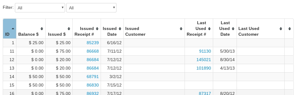 - Issued Receipt- The receipt number of the transaction when the gift card was issued. These are hyperlinked to the register screen with the total receipt.