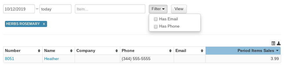 Use the field in the top left area of the report to customize the item report. The top row of field will use calendar pop-ups to allow you to select the time frame used to populate the report table, then filter by whether the customer has a phone number or email on their account using the drop-down menu, then add which item or items you want to search by and click "View" to generate the report.