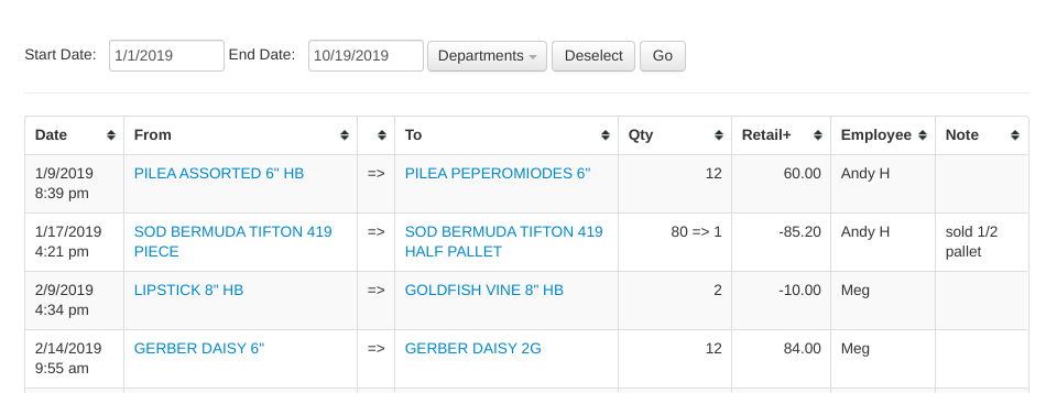 View a complete log of all conversions over any period of time! Filter by department, quickly link to item pages, and view the conversion note- all from this report!