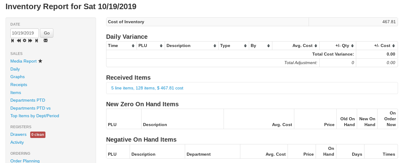 Total adjustments and total cost variance- The Total Cost Variance will show the total dollars added or subtracted from the Cost of Inventory for the day, while the Total adjustments will show the number of inventory changes made for the day and the absolute value of modifications of inventory.