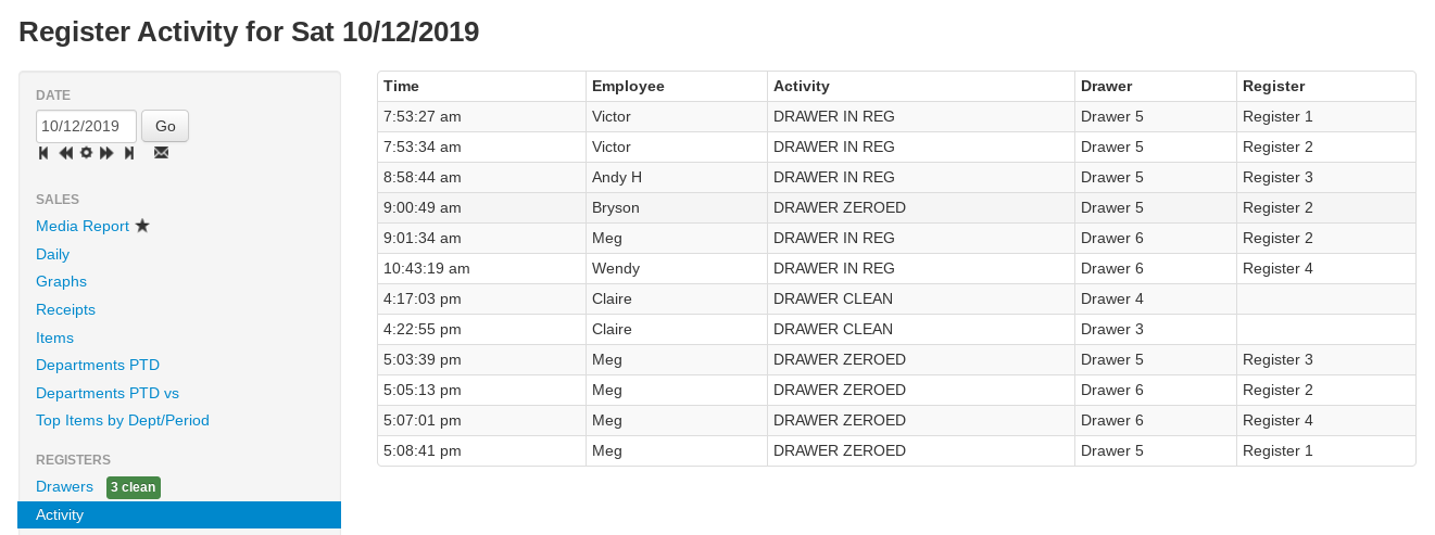 - Activity- What activity took place. This is usually adding a drawer to a register (also called "opening a drawer"), Zeroing a drawer (also called "closing a drawer"), or cleaning a drawer.