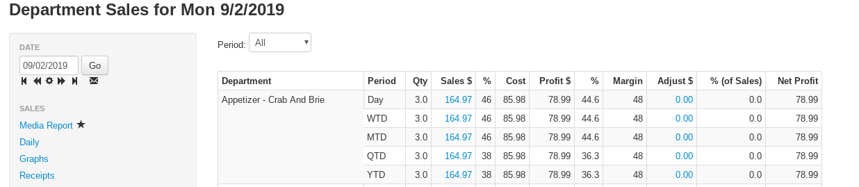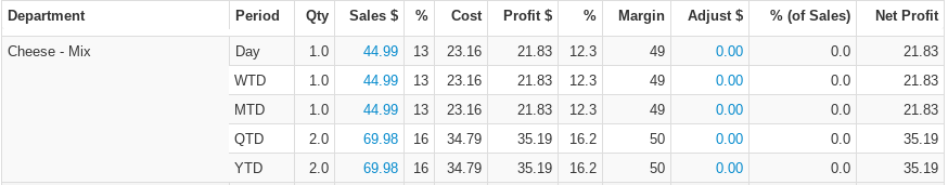 - Adjustment dollars- The total cost of adjustments of this department in inventory. Adjustments include cost changes, quantity changes, warrantied items and more. Select this value to be redirected to the corresponding Inventory Adjustments PTD