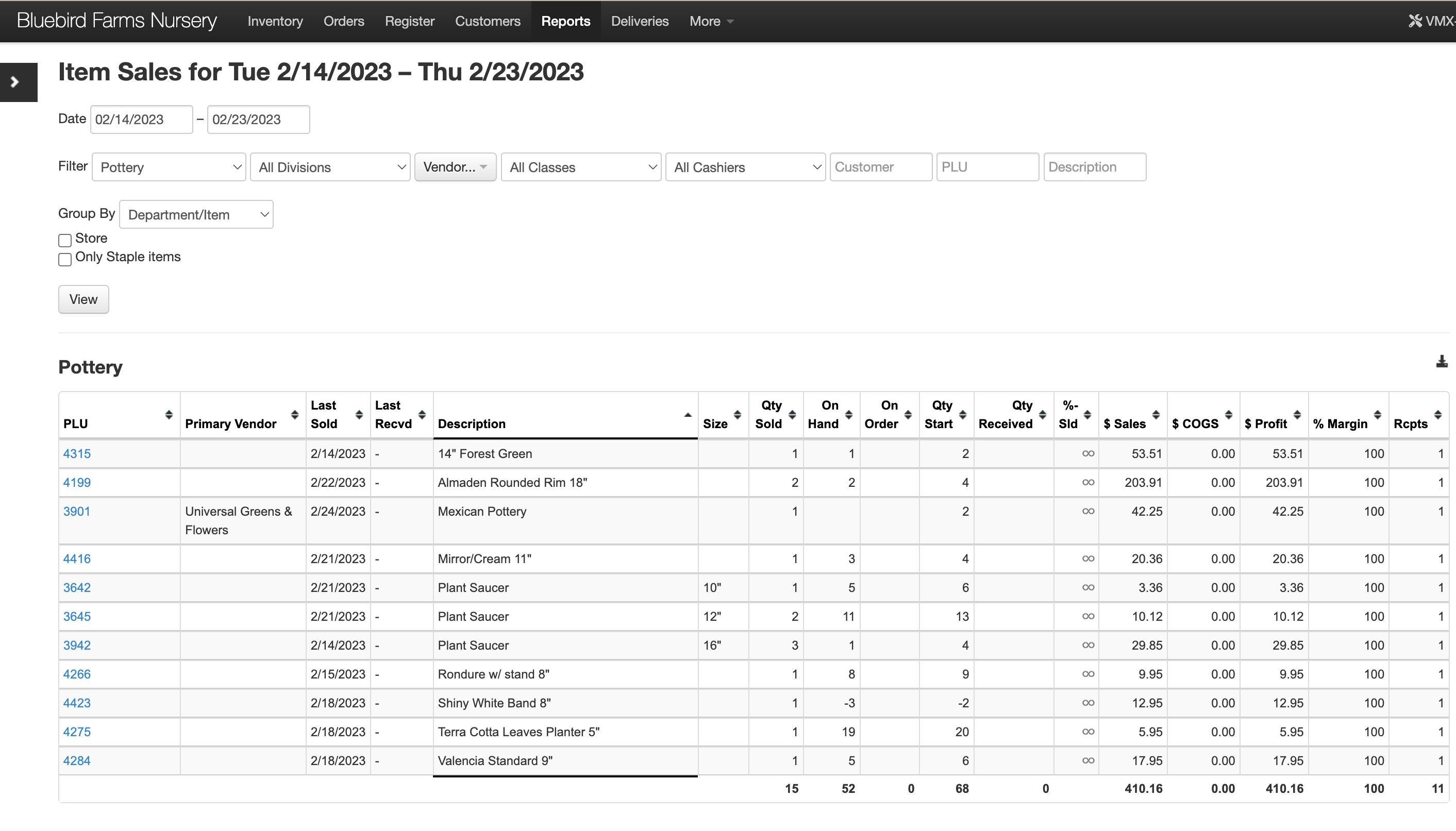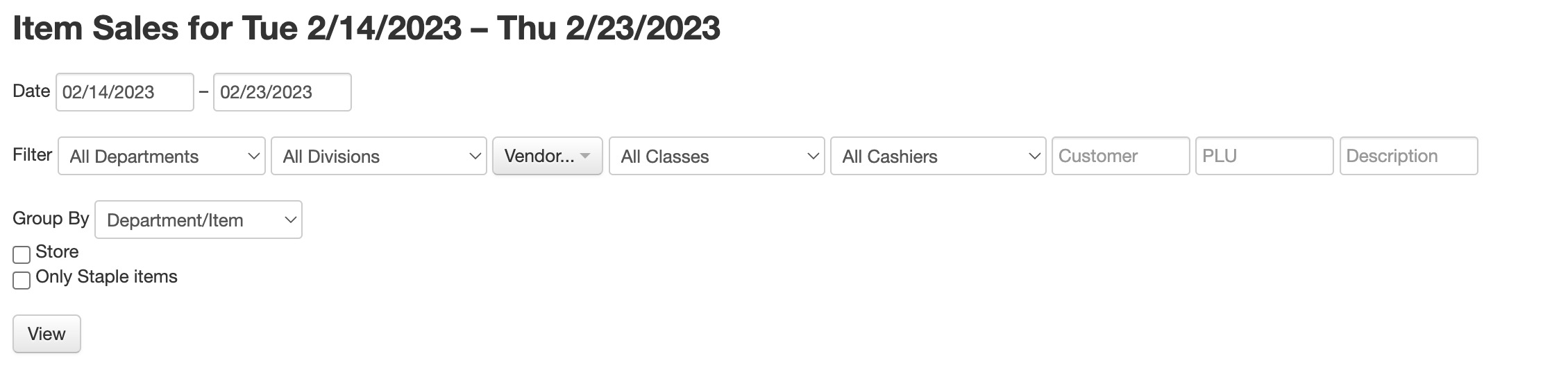 Use the field in the top left area of the report to customize the item report. The top row of field uses calendar pop-ups to allow you to select the time frame used to populate the report table. Then filter by department, division, vendor, class, cashier, customer, PLU or Description. Then select the third row drop down to determine how to group the information. Select the "View" button when you are ready to populate the table.