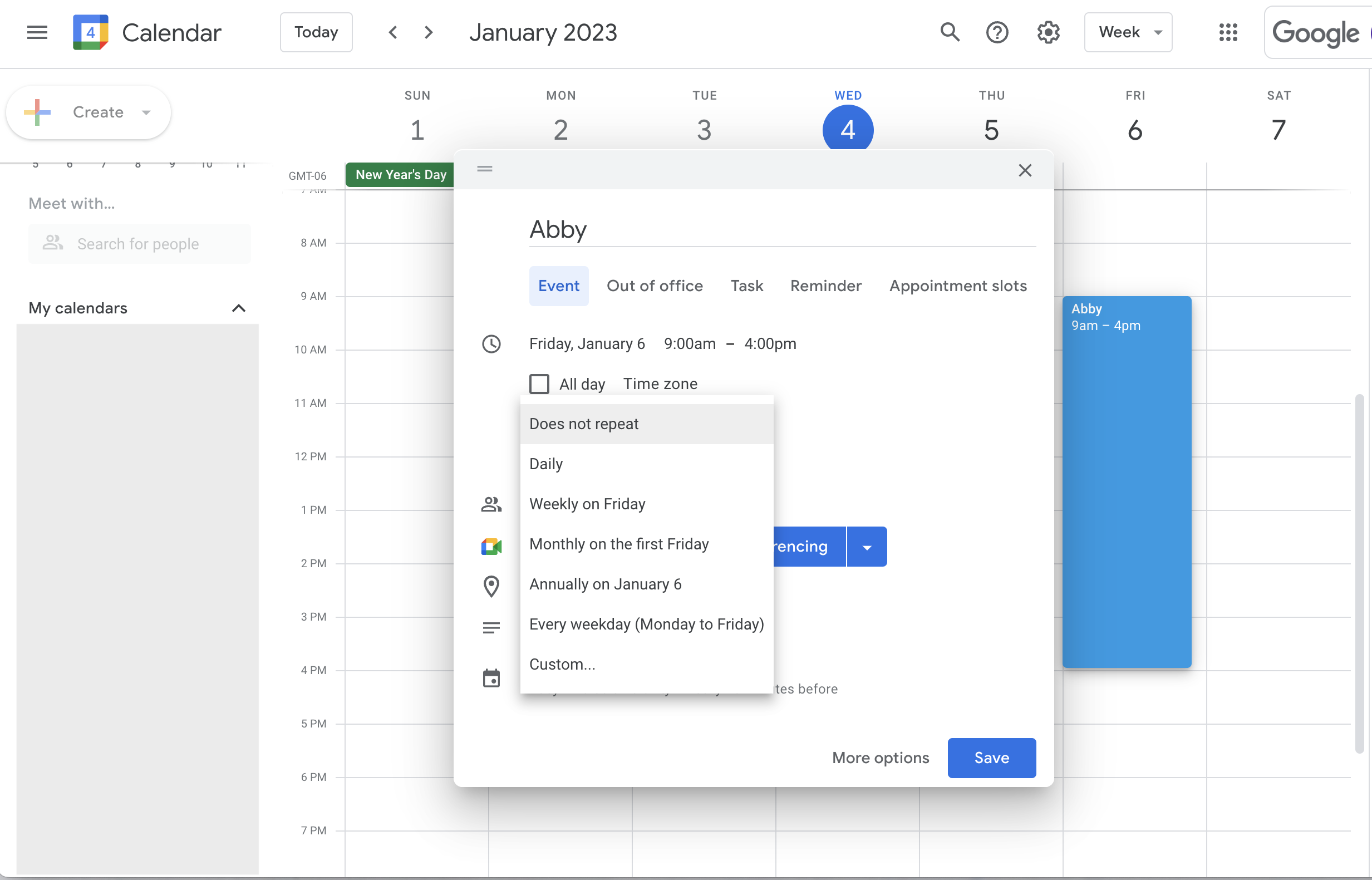 Select the correct date and time range the employee will be working. If the employee works these times consistently you can set the event to reoccur by clicking the "Does not repeat" dropdown.